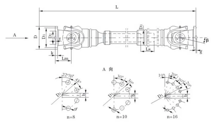 | नाही. | गायरेशन व्यास डी मिमी | नाममात्र टॉर्क Tn KN·m | अक्षांचा पट कोन β (°) | थकलेला टॉर्क Tf KN·m | फ्लेक्स प्रमाण Ls मिमी | आकार (मिमी) | फिरवत जडत्व kg.m2 | वजन (किलो) | |||||||||||
